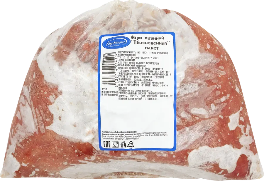 Фарш куриный замороженный АГРОФИРМА БОРОВСКАЯ Обыкновенный, весовой идеально подходит для домашних котлет, биточков, тефтелей, зраз и мясных запеканок. Фарш можно использовать для приготовления холодных и горячих закусок, а также его обжаривают на сковороде с луком и морковью или тушат в мультиварке с рисом, грибами или картофелем. Состав: мясо куриное механической обвалки, дату/время изготовления см. на доп.стикере или листке-вкладыше.